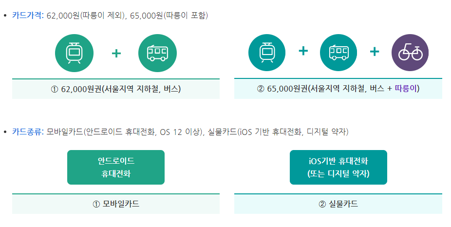 기후동행카드 종류는 2가지 인데요. 따릉이 포함가격(65000원)과 따릉이 제외가격(62000원) 두가지 입니다.