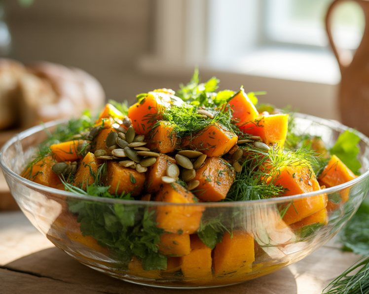 단호박 샐러드 – 삶아 으깬 후 채소와 섞어 영양 만점 간식으로