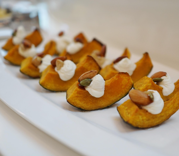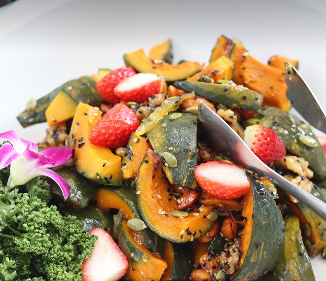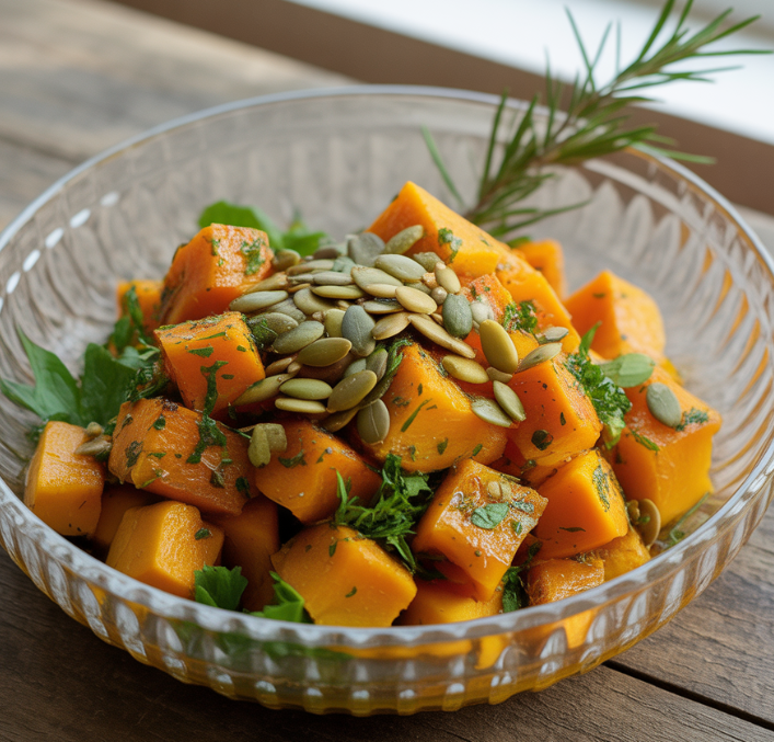 단호박 샐러드 – 삶아 으깬 후 채소와 섞어 영양 만점 간식으로