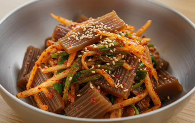 양념장은 도토리묵 무침의 ‘맛의 핵심’이라 할 수 있습니다. 간장으로 짠맛을, 고춧가루로 매운맛을, 식초와 매실청으로 새콤달콤함을 더해 조화로운 맛을 완성하는 것이 중요합니다.