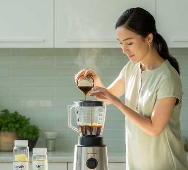 버터와 MCT 오일은 지방이 풍부해 소화가 천천히 진행되므로 아침 한 잔으로 점심까지 허기가 덜합니다.