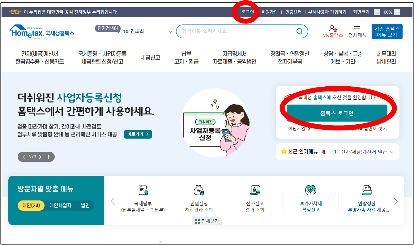국세청 홈택스 홈페이지에서 로그인을 해줍니다. 공인인증서를 등록해놓으시면 빠르게 로그인하실 수 있습니다.