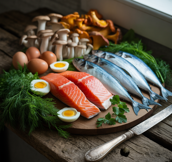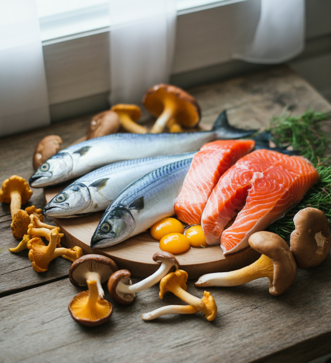 식단 관리: 연어, 고등어, 달걀, 버섯 등을 자주 식단에 포함시키는 것이 좋습니다.