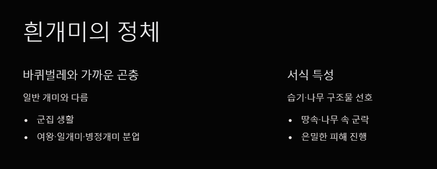 흰개미는 이름만 '개미'일 뿐, 생물학적으로는 바퀴벌레에 더 가까운 곤충입니다. 실제로 개미처럼 분업 구조를 가진 군집 생활을 하고 여왕개미, 일개미, 병정개미로 역할이 나뉘어 있지만, 습기와 나무 구조물에 특화된 서식 특성을 가지고 있어 서식지부터 활동 방식까지 전혀 다릅니다.